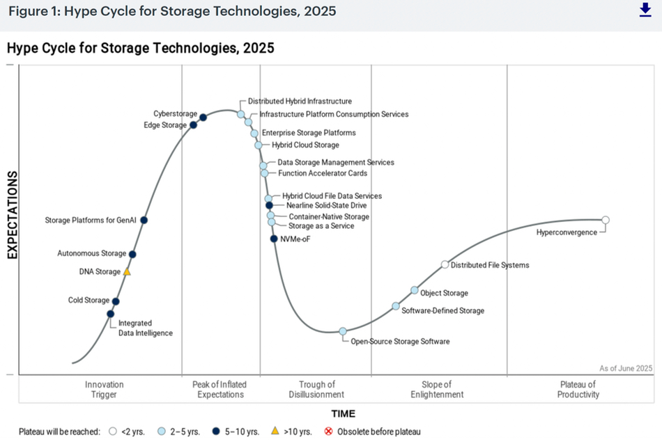 Peer Software has provided access to the Gartner Hype Cycle for Storage Technologies, 2025. The strategic planning assumptions are: