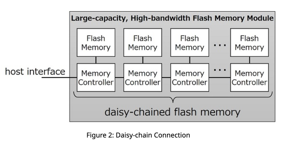 Kioxia’s high-bandwidth flash (HBF) has beads of flash and controllers connected in daisy-chain fashion to each memory board instead of a bus connection. It says that “bandwidth is not degraded even when the number of flash memories (beads) is increased.” The 2 bits per daisy-chain signal is achieved with PAM4 (4-level Pulse Amplitude Modulation) with four distinct voltage levels used to encode data, giving four possible 2-bit combinations; 00, 01, 10, and 11. PCIe 6 also uses PAM4 signalling.