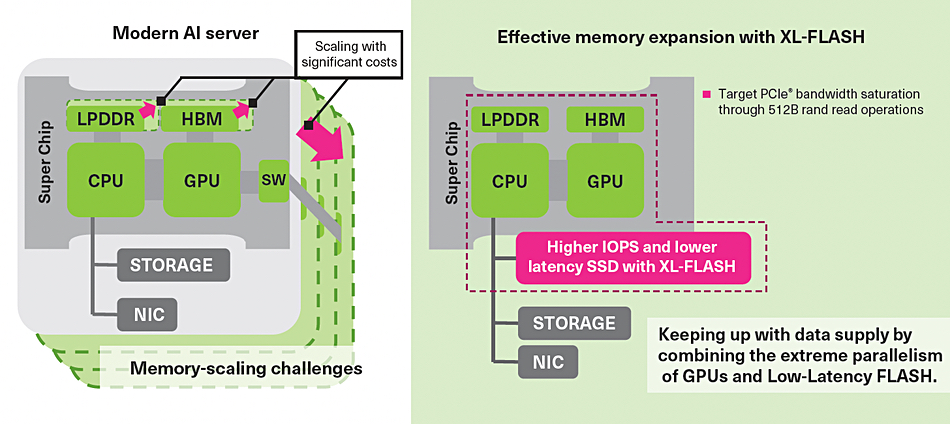 A Kioxia-America infographic, dated 2025, presents XL-Flash as a CXL-attached memory extension for GPUs, with average read latency under 10 μs. No IOPS numbers are given but then CXL is a coherent memory load-store mechanism, not a block transfer technology like NVMe. We believe this could indicate that Fukuda may not have been referring to a CXL-attached AI SSD.