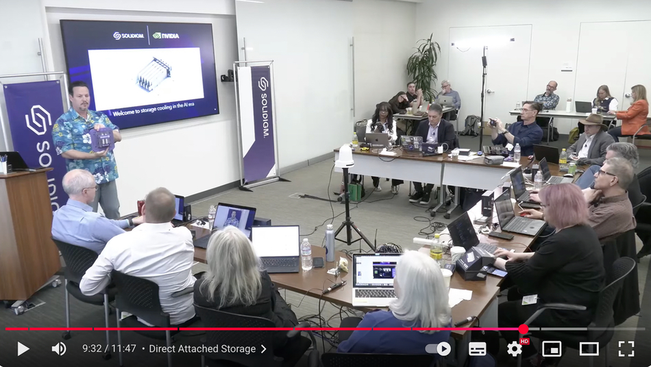 In a YouTube video, we can watch Solidigm’s Director of Leadership Narrative and Evangelist, Scott Shadley, explaining this to a Tech Field Day audience: “We were given a footprint of 8 x 15 mm E1.S, which is what is in the brains of the direct-attached storage of the Nvidia reference design, and they said, ‘Find a way to take the fans out of it.’ The traditional way we do this is to fit eight of these guys with a fan with air fins on it.”
