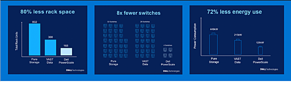 In particular, the PowerScale F710, which has achieved Nvidia Cloud Partner (NCP) certification for high performance storage, delivers 16k+ GPU-scale with up to 5x less rack space, 88 percent fewer network switches, and up to 72 percent lower power consumption compared to these two competitors.
