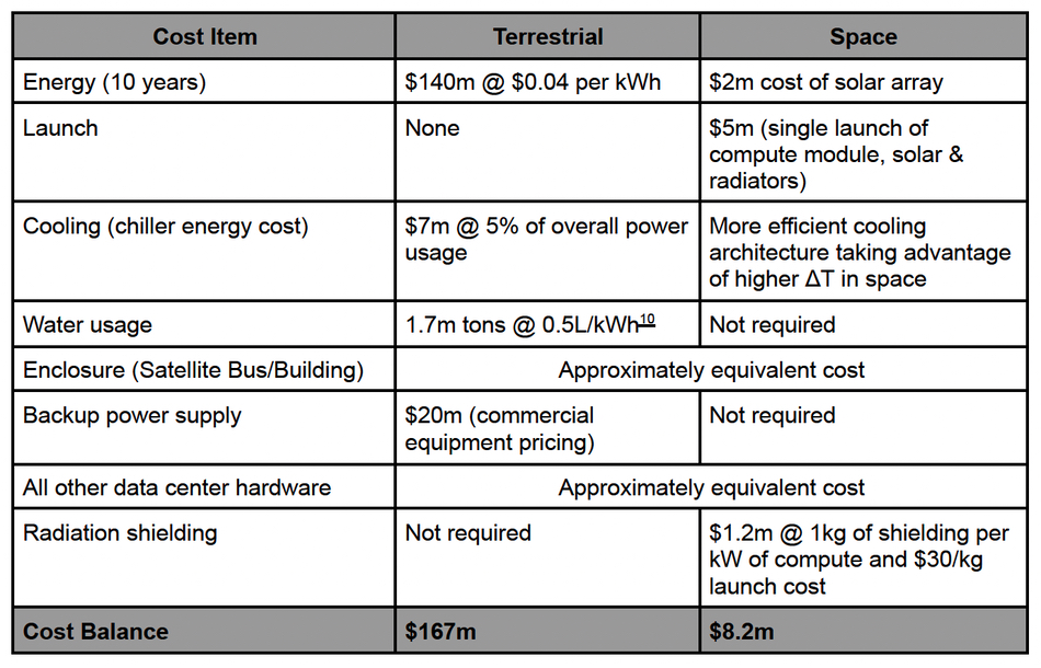 This points out power, cooling, and planning restrictions on datacenter build-outs on Earth, and compares some of the datacenter build, equipping and operating costs for a 40 MW datacenter cluster in orbit over ten years in a table: