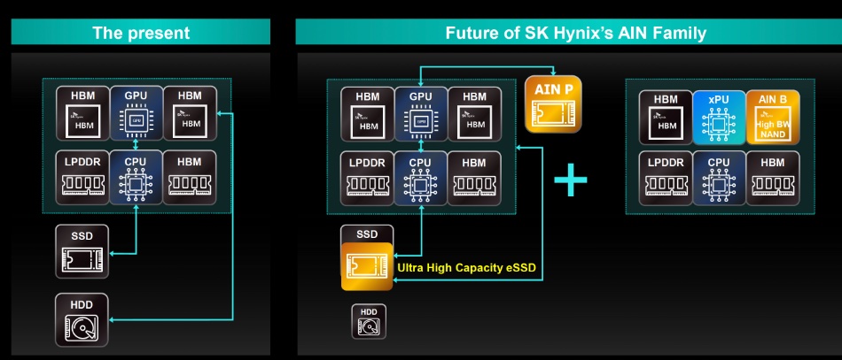 AIN (AI NAND) is SK hynix’s AI NAND strategy, with performance (AIN P), density (AIN D) and bandwidth (AIN B) product development directions. AIN P drives will process large volume data generated by large-scale AI inference workloads. Petabyte-class AIN D SSDs are intended to replace disk drives by storing large amounts of AI data with low power consumption and cost with SSD speed and HDD cost-efficiency.