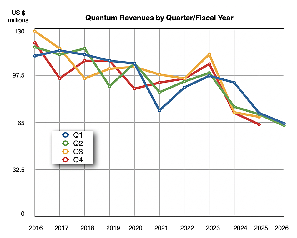 Quantum has reported a 12.7 percent drop on revenues to $62.7 million and widening net losses of $46.45 million for Q2 of its fiscal 2026 ended September 30, according to recently filed financial results.
