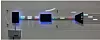 The leftmost black unit is the optical packet switch input point, receiving data and header signals from an input port. These are sent in sequence and in parallel to a non-linear and frequency-mixing photonic processor. There are white data packets on the upper optical cable and green, yellow and red color header information, synchronized with the correct data packets, on the lower cable. The two sets of signals arrive in sequence at the switch’s processor and it sends them onwards to the output port demultiplexer complex (right hand black truncated triangle shape) which routes them out through the correct port.