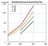 Snowflake’s revenue growth is accelerating, as a second chart shows, with its steepening quarterly revenue lines.
