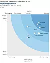 This 4-box variation diagram positions suppliers in a square space defined by a vertical weaker-to-stronger current offering axis and a weaker-strategy-to-stronger-strategy horizontal axis. There are three concentric quarter circles – waves – for Contenders, Strong Performers and Leaders with the remaining space for Challengers.