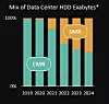 This enables improved track read and write accuracy. WD predicts it will get a 20 per cent capacity gain by shingling ePMR out to 2023, with 30TB SMR drives. The chart shows four generations of ePMR drives, starting with the 18TB HC550 this year, and followed by 20TB, 22TB and the 24TB product. The commensurate SMR product stages are 20TB ( HC650), 24TB, 26TB and 30TB.