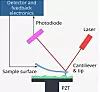 A C-AFM tip is used in high-resolution scanning to touch and measure the surface height of material at the nanoscale and also its electrical conductance. The tip is on the end of a cantilever and moves up and down as the surface is passed below it. A mirror on top of the cantilever moves, altering the reflected position of a laser beam directed at it, indicating the tip’s deflections. The reflected laser light is measured by a photodiode.