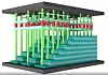 YMTC’s new chips use a second generation of the company’s proprietary Xtacking technology. This separates the manufacture of the NAND chips and controller chips, with each on their own wafers. The chips are attached electrically through billions of metal VIAs (Vertical Interconnect Accesses). The VIAs are formed across each NAND and controller wafer in one process step and the chips are then cut out. NAND chips and controller chips are mated so that the VIAs line up (shown by the red pillars in the diagram below).